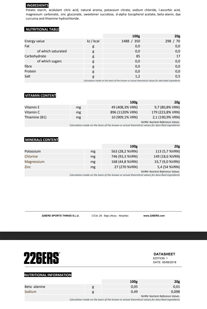 Jednoporcjowa saszetka o orzeźwiającym smaku cytrynowym lub czerwonych owoców. Każda porcja dostarcza cennych elektrolitów: 98 mg sodu, 113 mg potasu, 149 mg chlorku, 33,7 mg magnezu oraz 5,4 mg cynku. Dodatkowo, produkt wzbogacono o witaminy E, C, tiaminę (B1) oraz beta-alaninę.