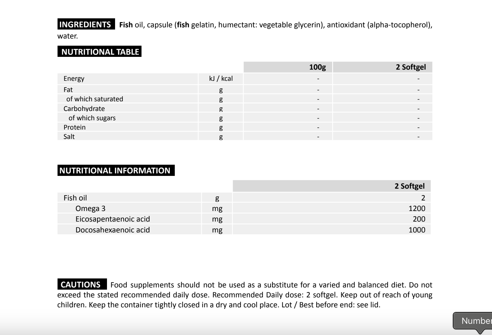Każda kapsułka dostarcza 600 mg Omega 3 z 500 mg DHA i 100 mg EPA w postaci naturalnych trójglicerydów, które są naturalną formą lipidów w diecie, a nie w postaci syntetycznego estru etylu, osiągając w ten sposób większą zdolność wchłaniania i biodostępność.