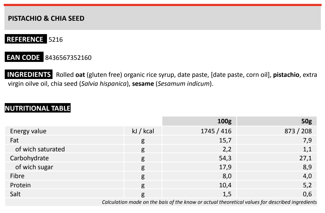 > Nasiona pistacji i chia, składające się głównie z płatków owsianych, daktyli, oliwy z oliwek z pierwszego tłoczenia, pistacji, nasion chia i sezamu